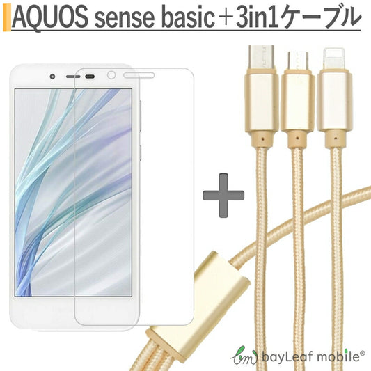 AQUOS sense basic ガラスフィルム 高透過率 薄型 硬度9H 飛散防止処理 2.5D 自動吸着 iPhone Micro USB USB Type-C 3in1充電ケーブル 1.2m