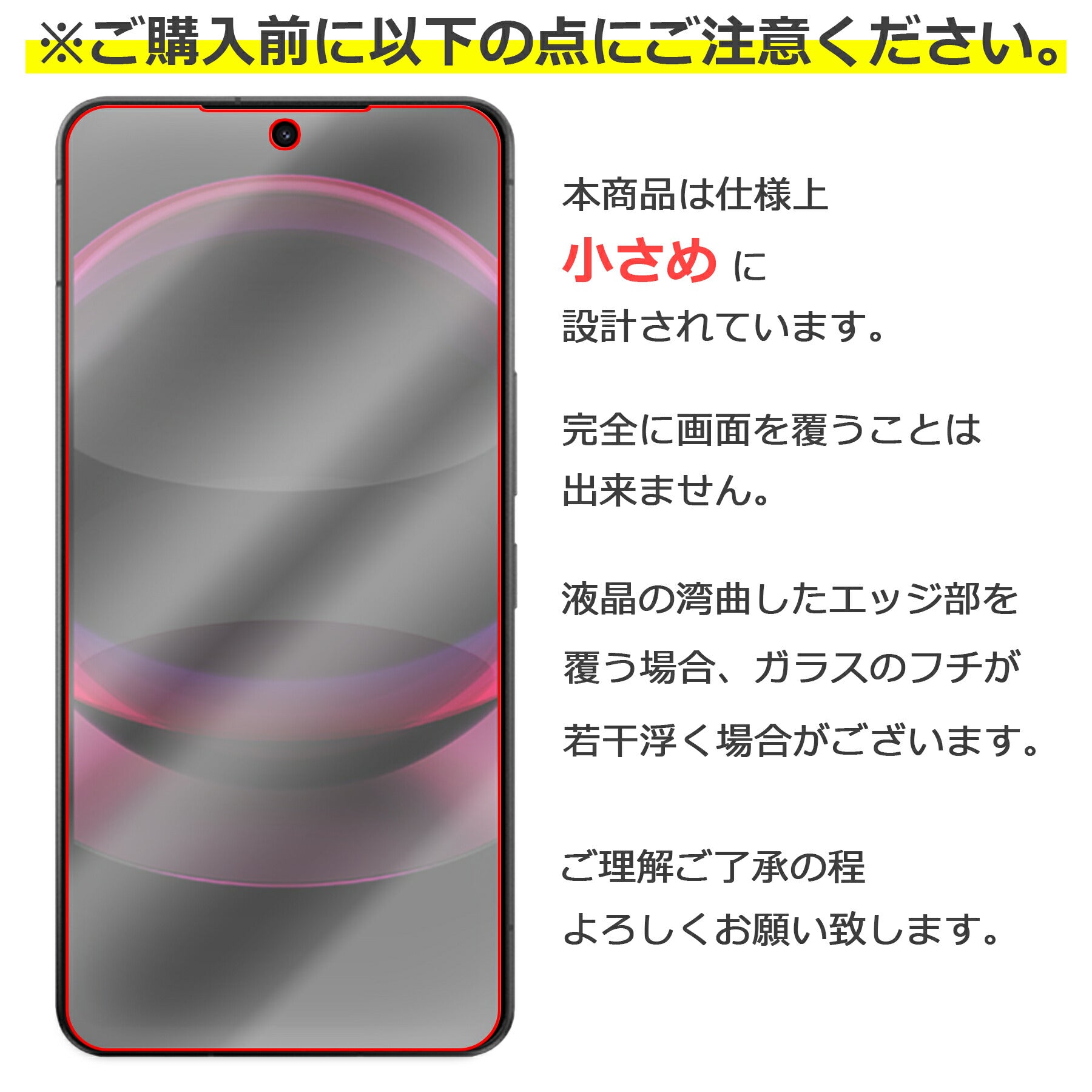 〇スマホ本体の液晶がエッジ(湾曲)タイプ機種の場合、エッジ部分に干渉しないように小さめに作られています。