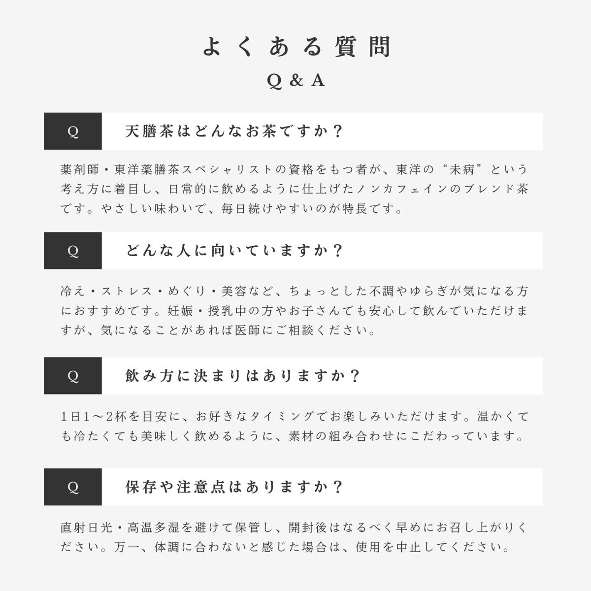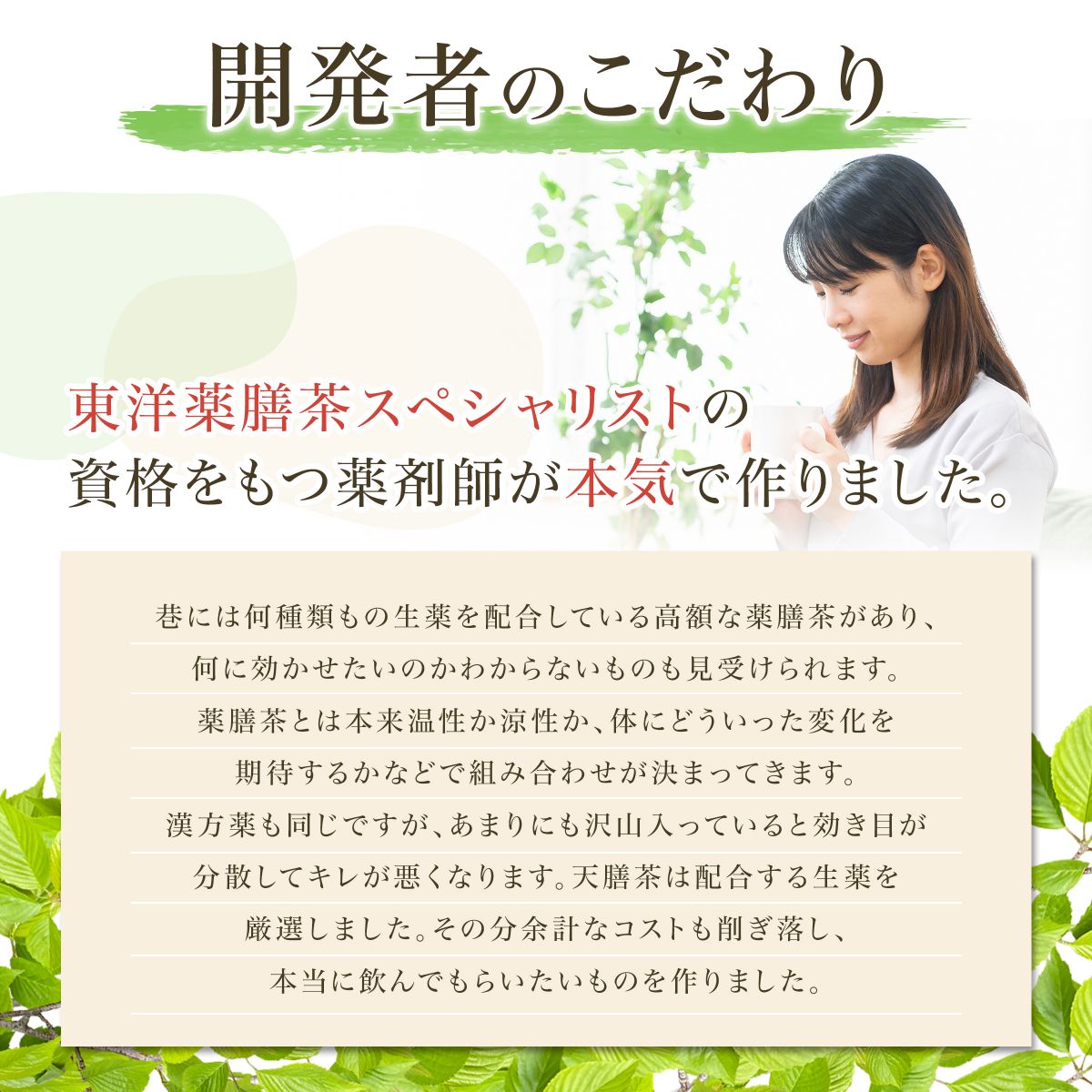 天膳茶は、薬膳や中医学の考え方を取り入れ、複数の生薬をバランスよく配合したブレンド茶です。毎日無理なく続けられることを大切にし、味にこだわりティーバッグタイプに仕上げました。お湯を注ぐだけで手軽に飲めるだけでなく、水出しにも対応しているため、季節を問わずお楽しみいただけます。